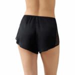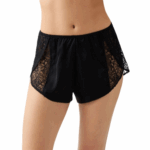 - Flirty satin shorty with overlapping eyelash lace panels at hip