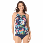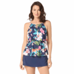 Layers of ruffles make this tankini top fashionable and flattering. A high neckline with adjustable straps gives you comfortable coverage. The chic, colorful floral print is inspired by bright summer florals.