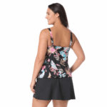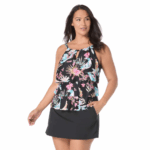 Layers of ruffles make this plus size tankini top fashionable and flattering. A high neckline with adjustable straps gives you comfortable coverage. The chic, colorful floral print is inspired by bright summer florals.